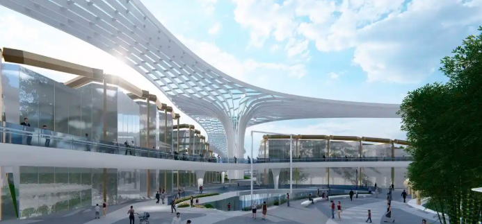 宜賓高鐵站采用膜結(jié)構(gòu)連廊天幕,兼具遮陽與導(dǎo)流功能。