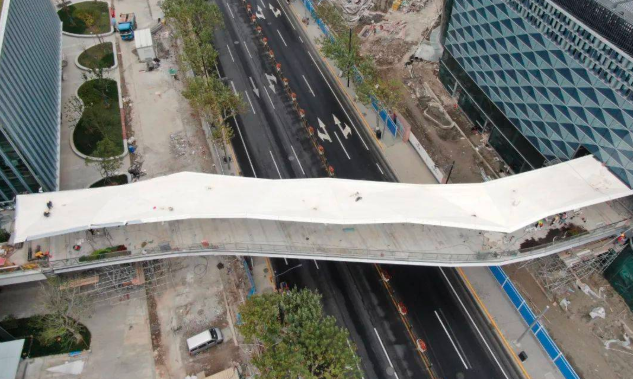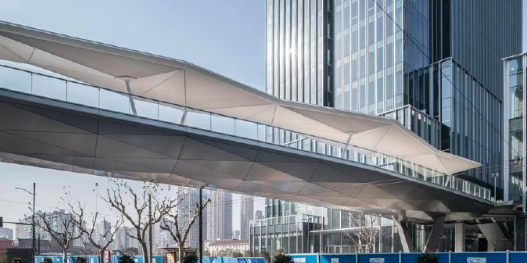 北外灘空中連廊示范段首創(chuàng)帶膜結(jié)構(gòu)陽光棚,總長(zhǎng)4.5公里成為世界最長(zhǎng)城市連廊系統(tǒng)。