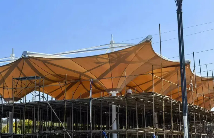 江西萍鄉(xiāng)美食街張拉膜結(jié)構(gòu)大棚工程進入施工階段,工程已完成鋼結(jié)構(gòu)安裝及膜材安裝工作,現(xiàn)場看到美食街大棚設(shè)計為倒傘式結(jié)構(gòu)。