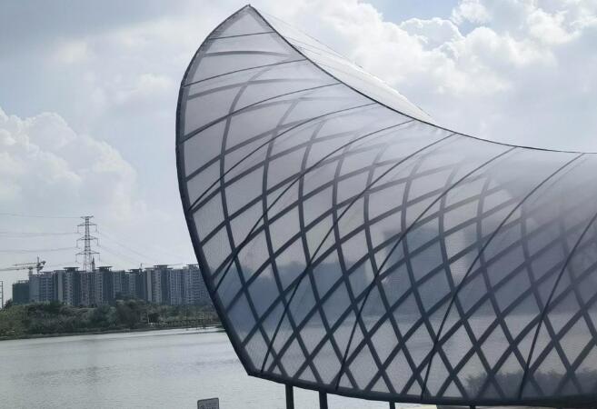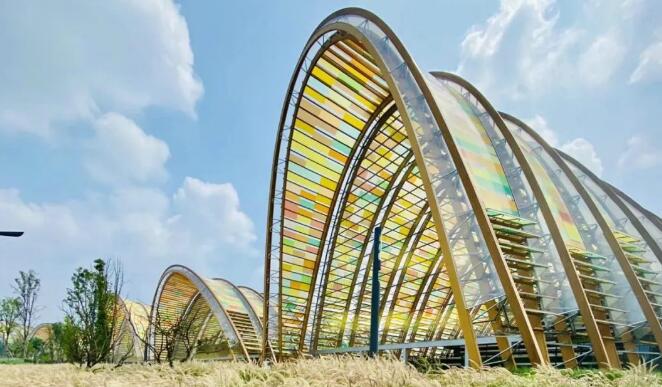 ETFE 膜材的優(yōu)點(diǎn):透光率高(透明膜材可達(dá)90%)、透光透景,色彩豐富(可以各種顏色,而且通過鍍點(diǎn)可以控制透光率和遮陽(yáng)系數(shù)),柔韌性好,非常適合應(yīng)用于(氣枕式)充氣膜結(jié)構(gòu)形式,以及膜單元板塊面積較小的單層張拉膜。