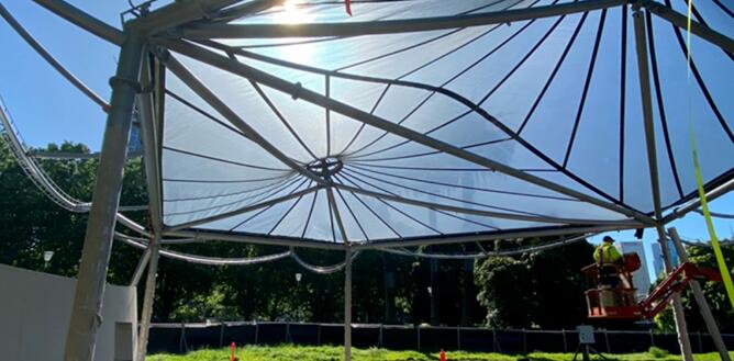 STFE 膜材的優(yōu)點(diǎn):覆膜的清晰度較好,可實(shí)現(xiàn)一定程度的透景。同時(shí),由于有織物基材提高了膜材強(qiáng)度,抗拉強(qiáng)度可達(dá)4000N/5cm。即使不加拉索,膜單元跨度一般在3m以上。
